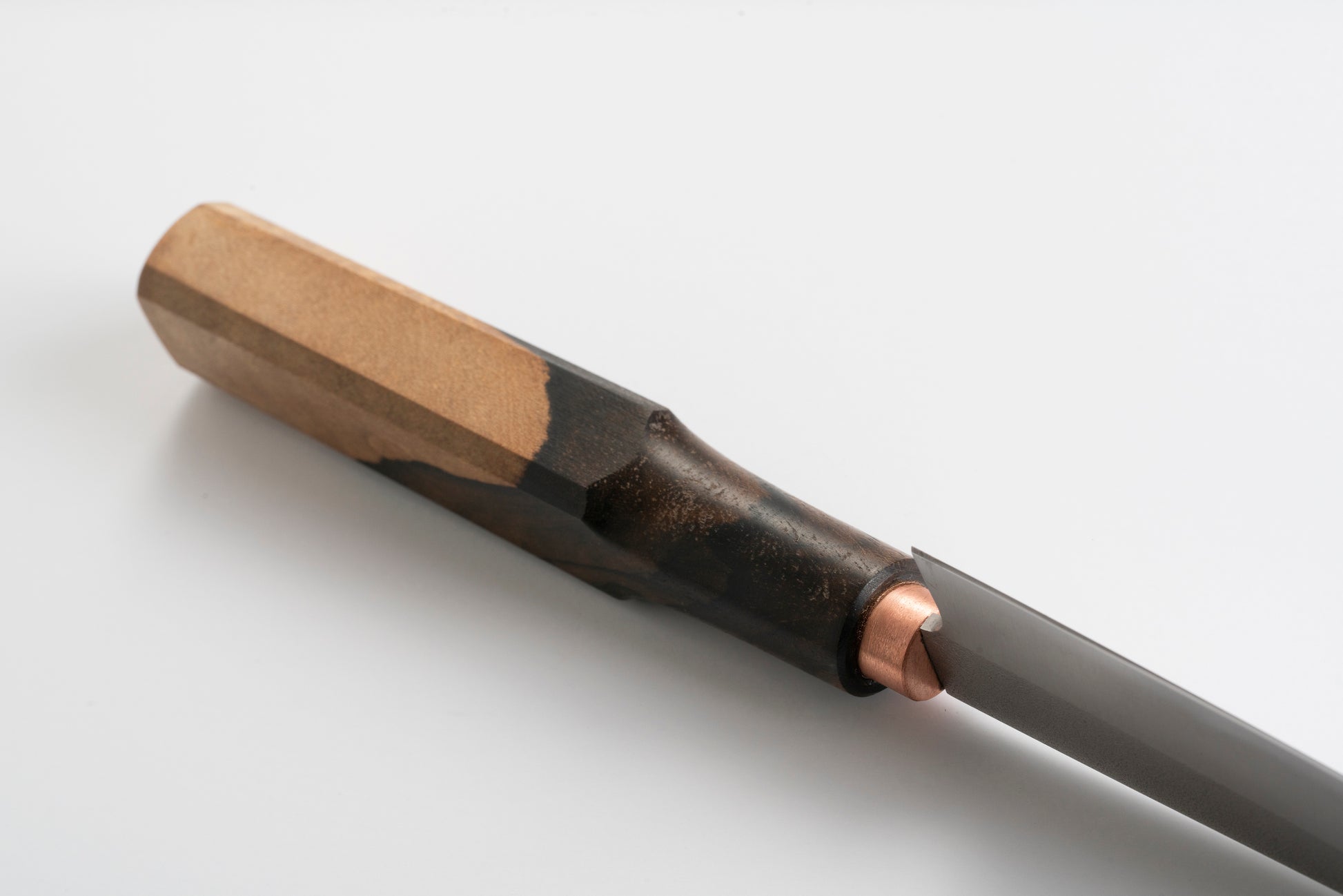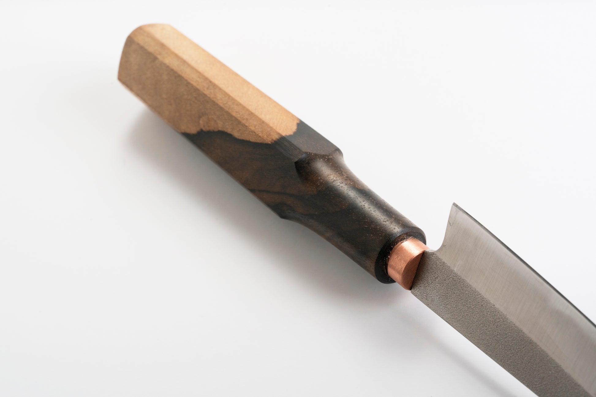Custom-made, hand-crafted Kiritsuke style Chef's knife. Hardened 4" N690 Stainless Steel and stabilized hand-sculpted Ziricote wood handle with Copper bolster.