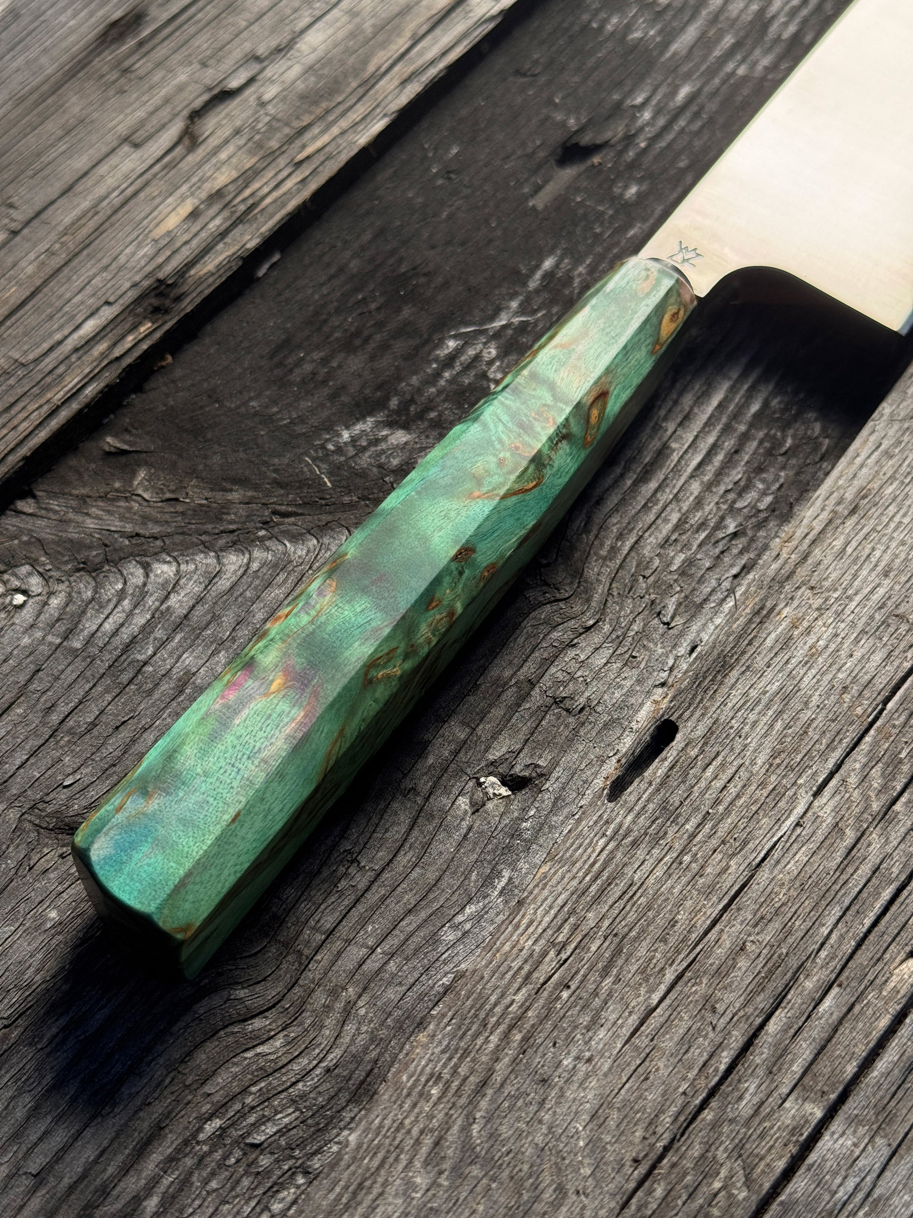 Custom-made, hand-crafted Nakiri style Chef's knife. Hardened 6" 4116 Stainless Steel blade and stabilized hand-sculpted, green stabilized Karelian birch handle with ebony bolster.